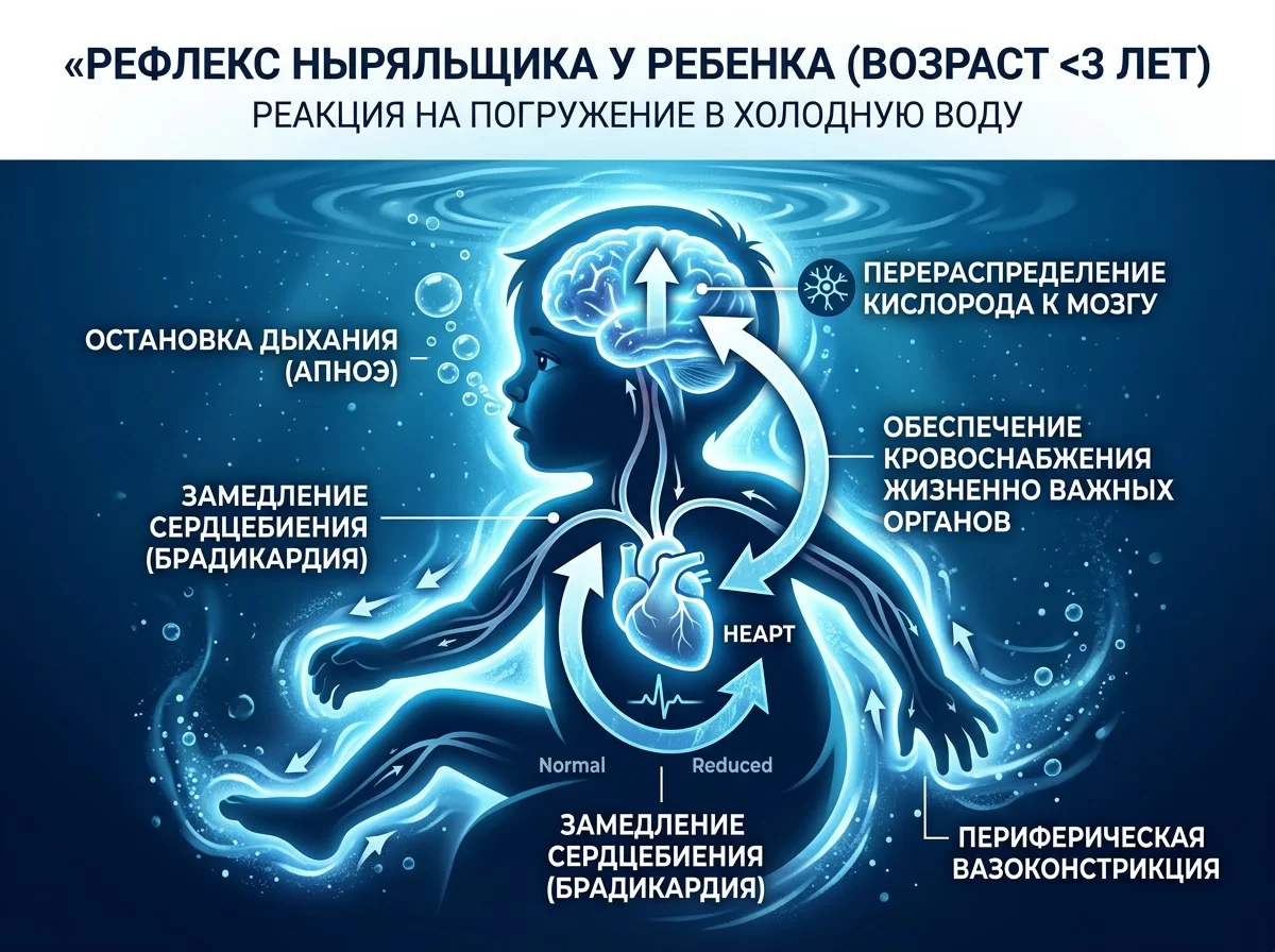 Когда маленький ребёнок попадает в холодную воду, в его теле запускается древнейший защитный механизм — так называемый «рефлекс ныряльщика». Сердцебиение резко замедляется, обмен веществ падает почти до нуля, весь кислород организм направляет к мозгу и сердцу. По сути, тело переходит в режим глубокой «спячки».