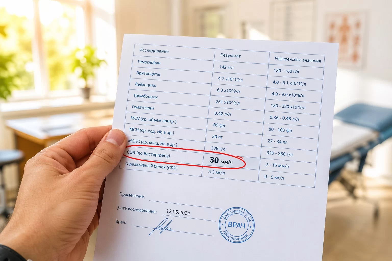 Начнём с СОЭ — скорости оседания эритроцитов. Этот показатель есть в каждом общем анализе крови, и большинство людей давно привыкли к тому, что он «немного повышен». Ну и что, скажут многие, у меня всегда так — наверное, стресс.